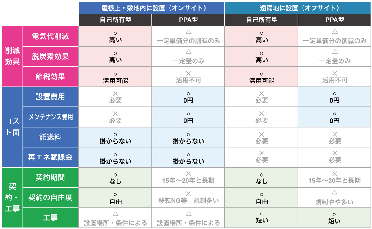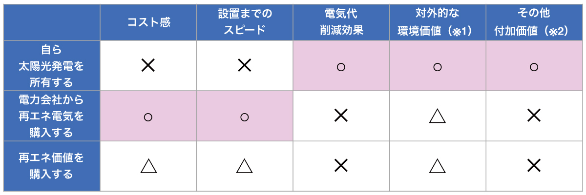 | 電気の再エネ化を実現するだけでなく、本質的な環境価値や、脱炭素化以外の付加価値も含めた場合、トータルメリットが大きいのは、「自ら太陽光発電を所有する」である。 |